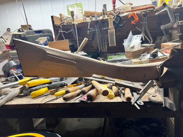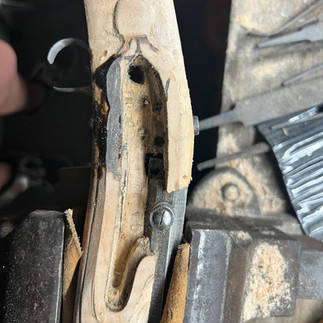Now that doesn't sound like a lot when you list it out, but it's a lot of tedious work and we ran into some challenges along the way. The biggest challenge we encountered was powderpost beatle damage in the stock. I'll post a separate blog about this with more detail on ways to resolve/deal with it, but you can see here the damage from the powderpost larvae. How did we fix it? We mixed wood shavings from the stock with the stain we're going to use and a bit of epoxy and filled in the holes, let it harden overnight and sanded it down.