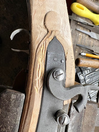 Now at this point, my dad had already done a decent amount of work on it. So over the last 6 weeks, working on it for 1-2 hours almost every night, we've drilled the tang bolt hole through the tang and the trigger, put in the wedge that holds the barrel in the stock, saudered on the rail and thimbles that hold the ramrod in place, drilled the pin hole for the thimble, completed the carvings for the lock and the side plate, and almost finished shaping the stock.